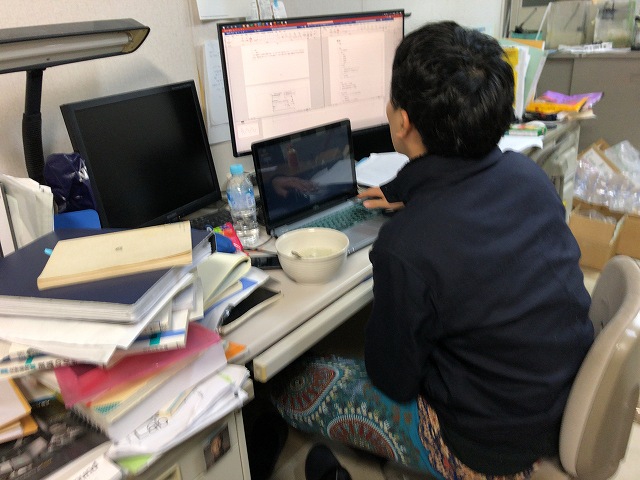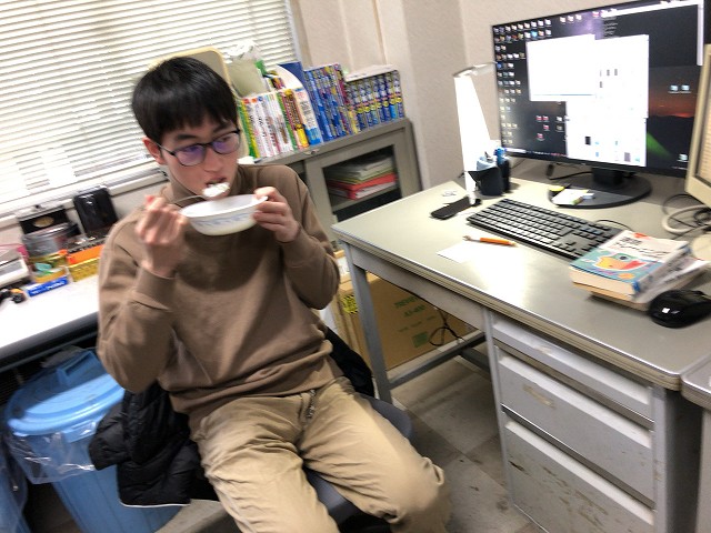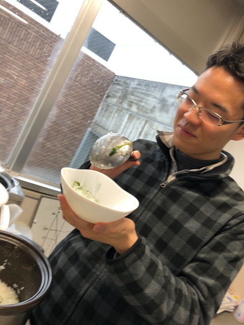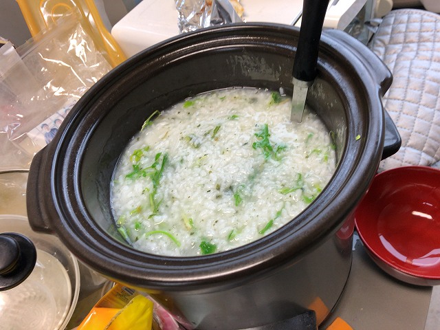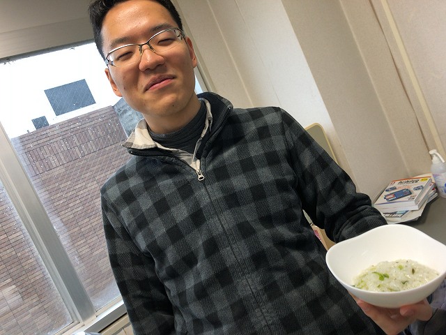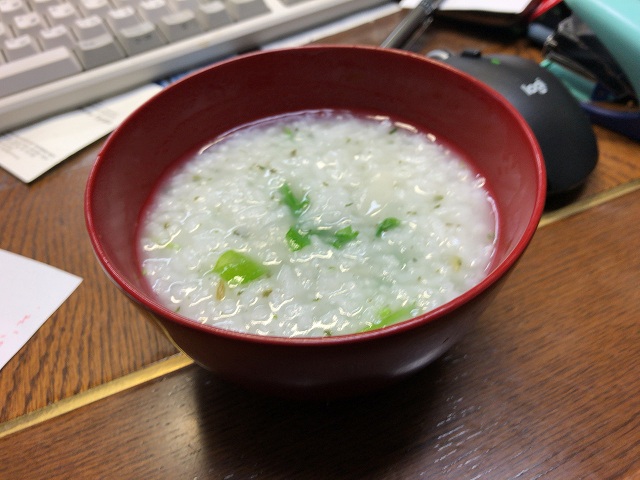 なんか、論文書いていると重いのはダメだし、軽いとおなか減るし、おかゆとかいいよね、と助教の人。七草がゆをみんなでいただきました。