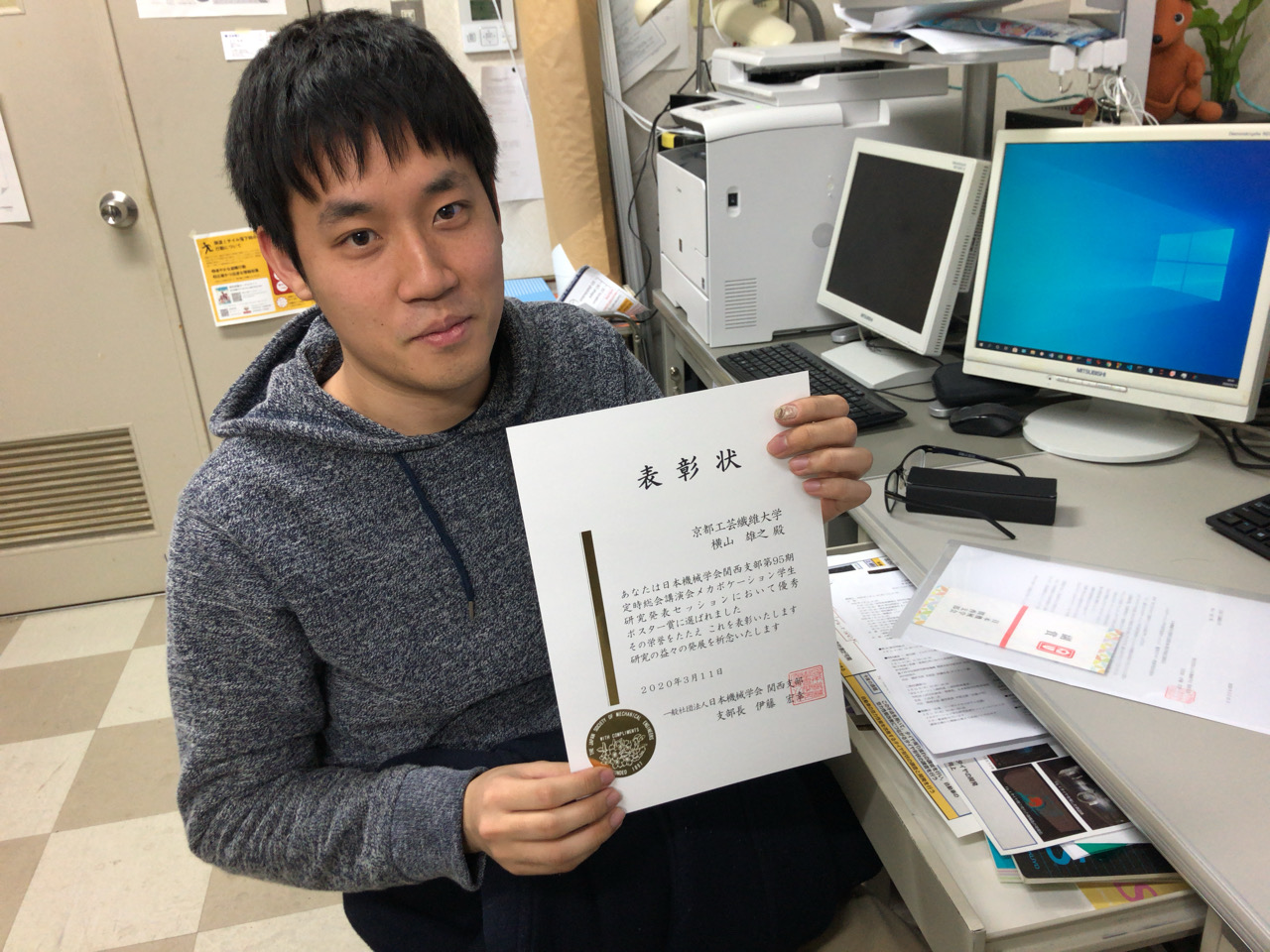 新型コロナウイルス感染の拡大で、日本機械学会 関西支部第95期定時総会講演会も中止になり、 ポスター原稿と予稿集で審査を行うことになりました。結果、横山さんが優秀ポスター賞を受賞しました。可視化 も1年前のBPAも受賞です!