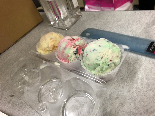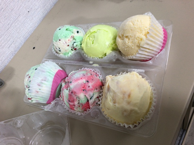 アイスクリームを買って来て保冷剤のドライアイスを実験で使います。以降は必要な量を決めて業者から購入する予定。 |