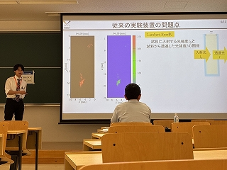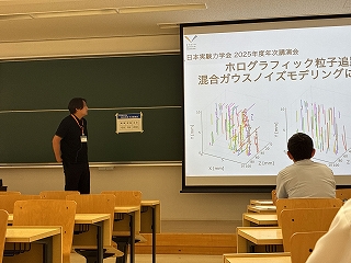 昨年の米沢市から日本実験力学会 2025年度年次講演会は大津市の龍谷大学瀬田キャンパスで開催です。 M1I谷さんが「位相回復ホログラフィを用いた微小液滴群の沈降速度計測」、M2S藤さんが「ステレオ PIV で得られた 3 次元速度場を用いた円柱周りの圧力分布推定」、M1O野さんが「定在波型熱音響冷凍機における温度差の周波数依存性に関する実験的研究」、M2S和さんが「Two-Sensor 法による断面積変化の異なる音響管の評価」、M1K櫻さんが「光切断法を用いた成層懸濁液混合挙動の3次元形状計測における光シート照射の改善」、D2N井さんが「ホログラフィック粒子追跡のための混合ガウスノイズモデリングによる軌跡平滑化」、M2I本さんが「理論と実験に基づくパラメータ同定を用いたエレキベースの 2 質点系連成振動モデルの評価」の発表を行いました。 准教授の人は「光学的手法の新展開とその応用(2)」で座長を担当しました。流体力学、音響工学、光学と多岐にわたっていますが、一貫して現象の定式化に必要な計測手法の研究です。 |
