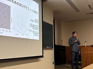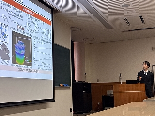 前回はつくば市でしたが、今回は日本実験力学会の分科会の1つの光学的手法分科会を本学の総合研究棟の多目的室で開催しました。M2I山さんが「位相回復ホログラフィによるマイクロチャネル内ナノリットル液滴体積」、M1I谷さんが「H-PTVを用いたゲッチンゲン型風洞内における微小液滴群の沈降速度計測」、D2N井さんが「雲微物理研究のためのホログラフィックPTV」を発表しました。 准教授の人は会の後半の座長を担当しました。M1I谷さん、M2I山さんは、懇親会で光学の超一流の研究者にじっくり疑問点を質問したり、貴重なアドバイスを貰えたとのこと。論文にも教科書にも載っていない話は懇親会で知る機会になります。 |
