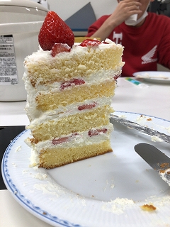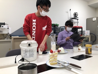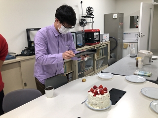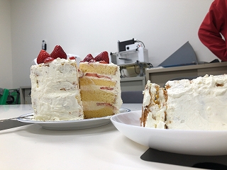 コロナや2回の引っ越しで中断していた前回から3年ぶりに開催。 その間研鑽を積んだ准教授の人曰く、「スポンジケーキの作り方を完全に理解した!」とのこと。スポンジが凹む原因は、 オーブンの火力不足のためレシピ通りは難しく、焼成不足。適宜竹串で様子をみながらだと上手く行く。レシピの再現性を考慮すると条件だけでなく、 確認方法の記載も大事とのこと。 |