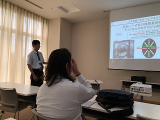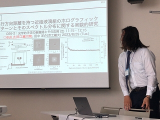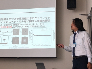 昨年の鳥取から日本実験力学会 2023年度年次講演会は和歌山市開催です。 29日に光計測の研究でM1I原さんが、「位相回復ホログラフィにおける粒子数密度が粒子再生像に与える影響」、 M2N井さんが「奥行方向距離を持つ近接液滴組のホログラフィックパターンとそのスペクトル分布に関する実験的研究」の口頭発表しました。 准教授の人が光学的手法の新展開とその応用 (3)で座長を担当しました。 30日に音響計測の研究でM2M井さんが,「熱音響のための自励振動の条件に関する研究」,M2T中さんが流体計測の研究で「多色レーザ光の時間差照射を用いたディジタルホログラフィ流動解析法」, M1Y﨑さんが「ディジタルホログラフィを用いた 3 次元 2 成分流速分布測定法の研究」の口頭発表しました。 准教授の人が流体の可視化と計測 (2)で座長を担当しました。例によって前泊,発表の方もいれば全部参加の方も。 |