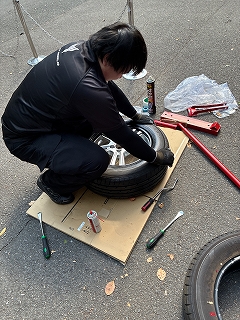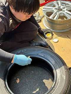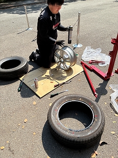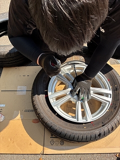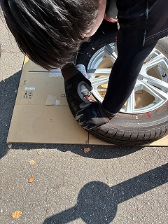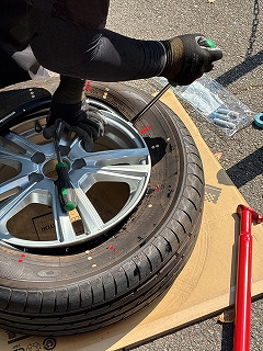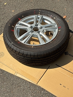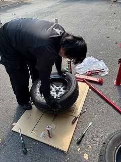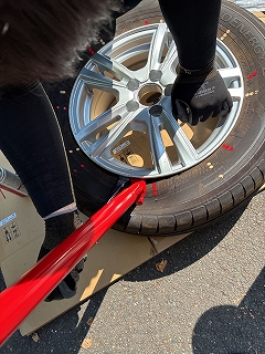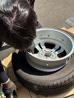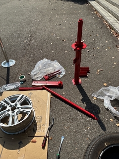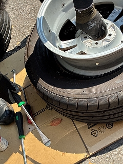 タイヤがぼちぼち経年劣化してきたのでホィールから外して交換です。今日は天気が良く絶好の交換日和でした。 |