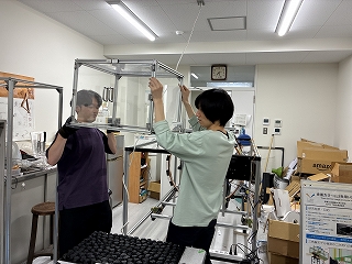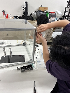 先日から組み立てていますが、NCが稼働すると切削くずの飛び散りが問題になります。そこでコロナ対策で今はお役御免になったポリカの透明プレートを流用してNCカバーを製作しました。 |