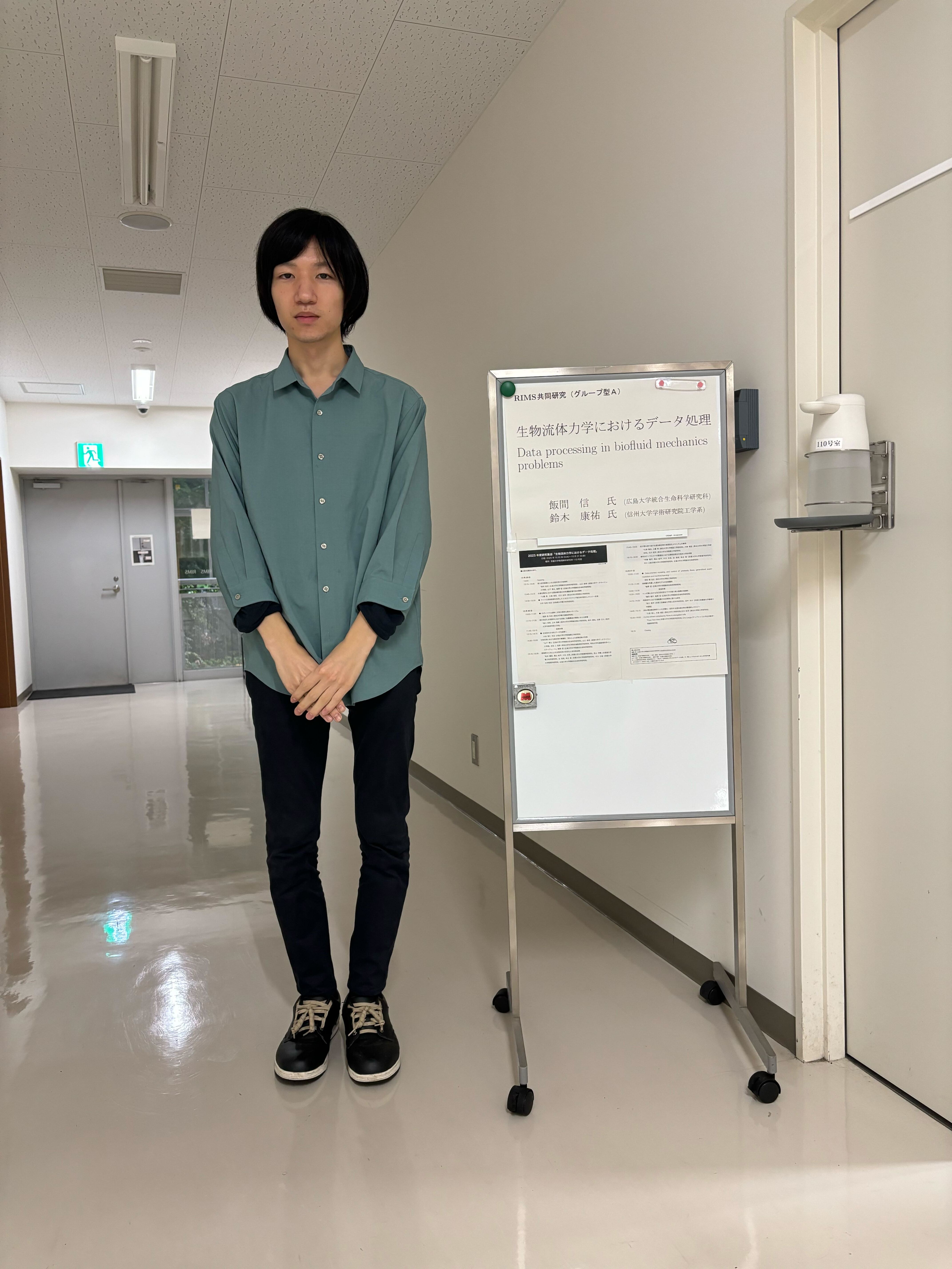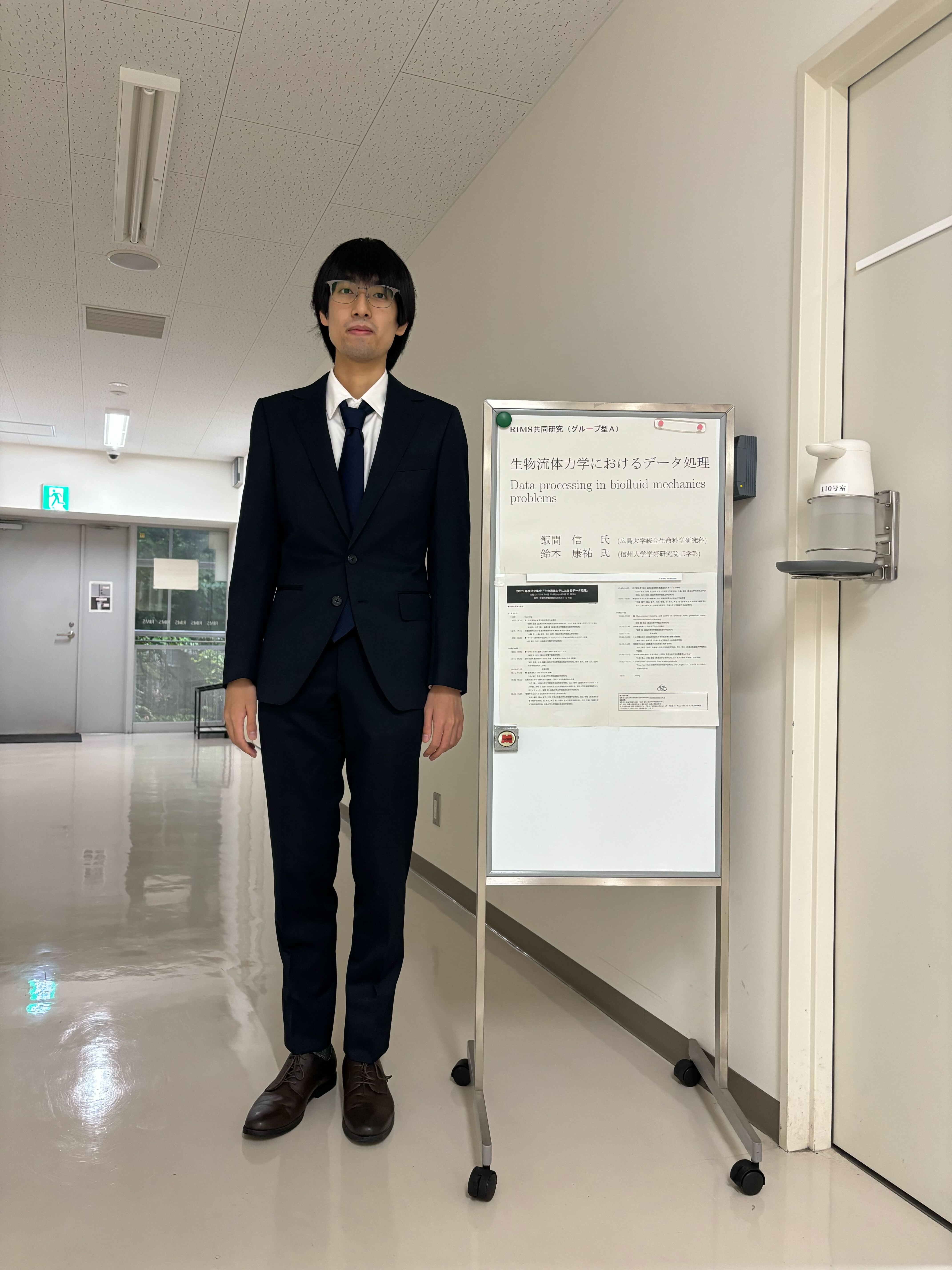 先日の流体力学会での発表が切っ掛けで、かつ一昨年ぶりの参加で、2025年度研究集会「生物流体力学におけるデータ処理」にて、M1S川さんが、「周期流中における振動翼の泳法開発に関する研究」について発表しました。 B4M浦さんは参加でしたが、質疑応答や懇親会などでいろいろ話が聞けて研究の参考になったとのこと。