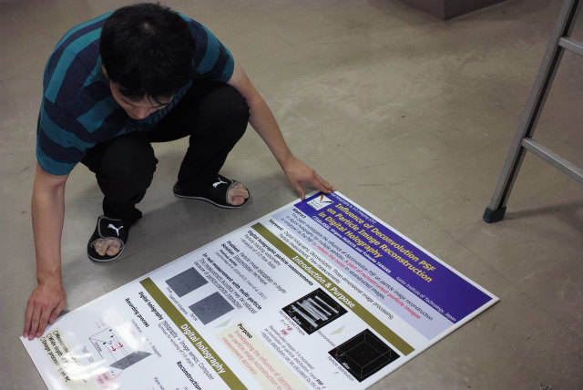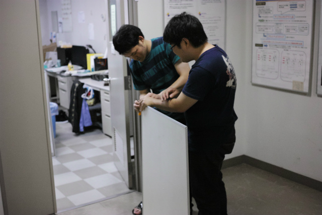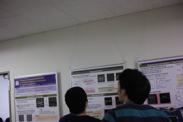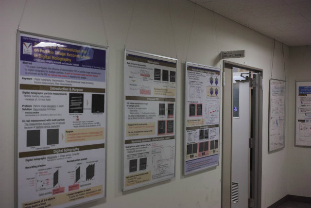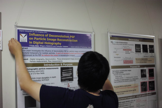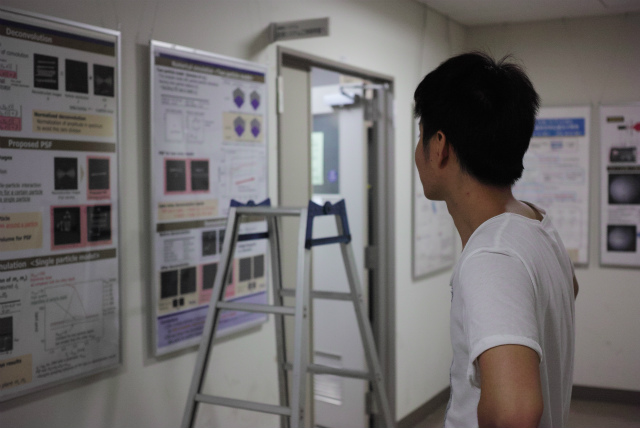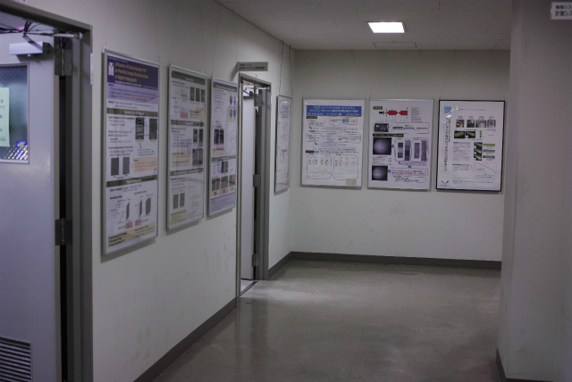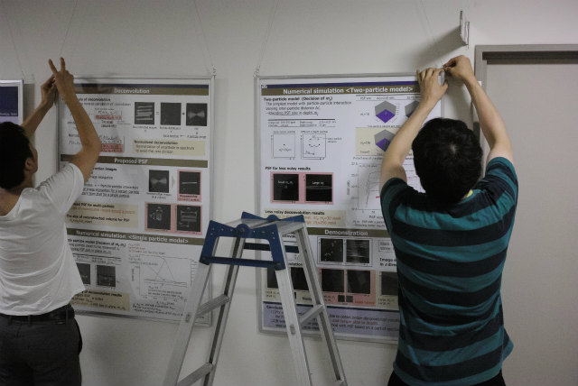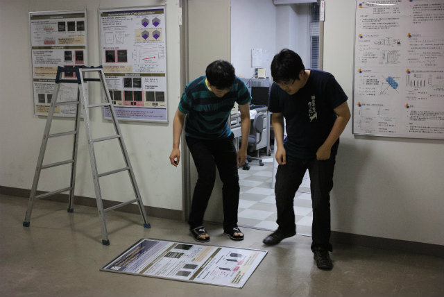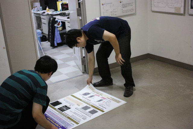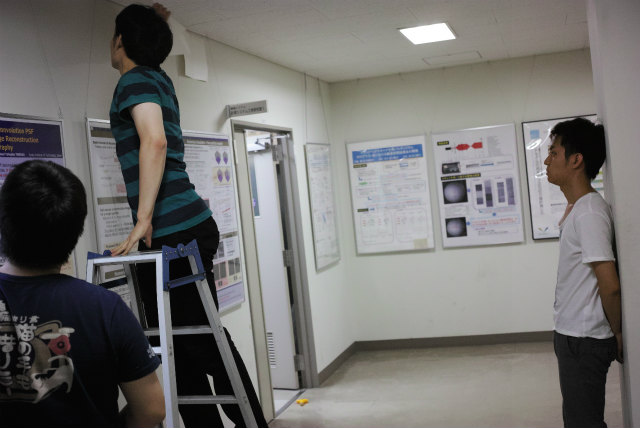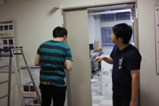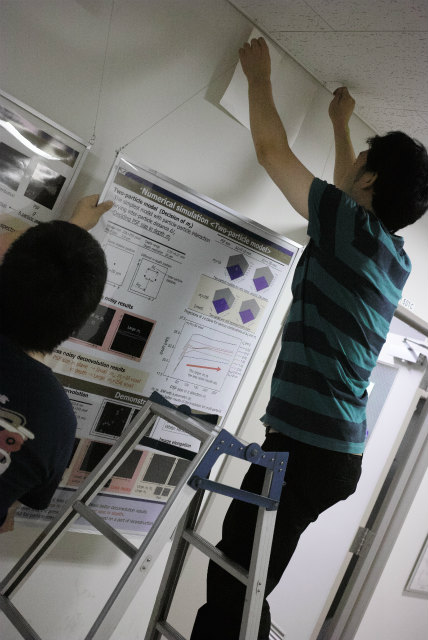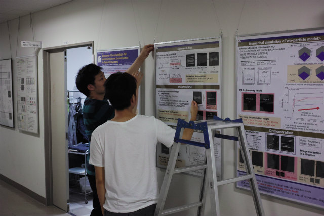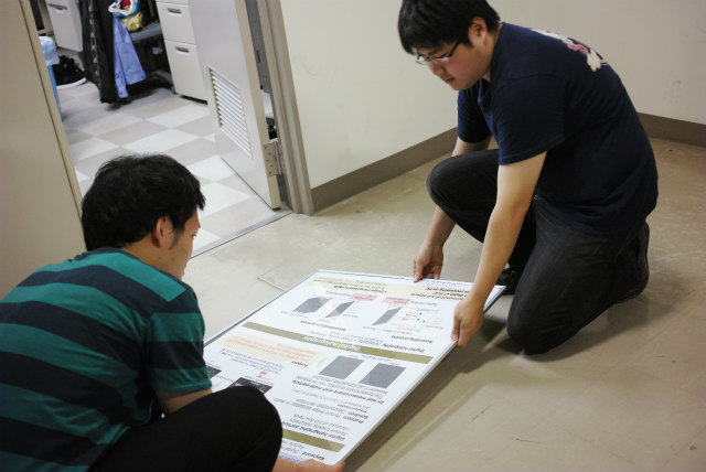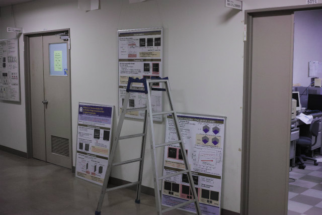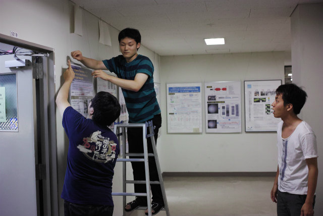 A井くんがいったこの前の学会で使ったポスターを掲示しました。助教の人が掲示にあたって、面を合わせてくれとか、ワイヤーで美しくとかの要望に応えるべく、M2ムー君の補助でM1A井くんがポスター掲示でガンバリマス。現場監督はtask。 |