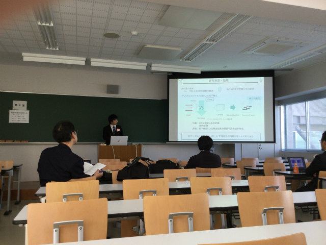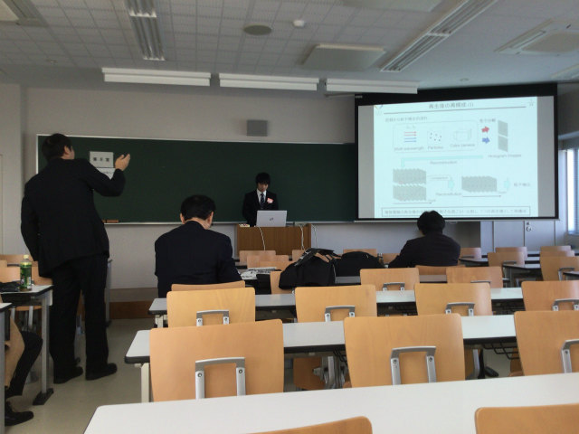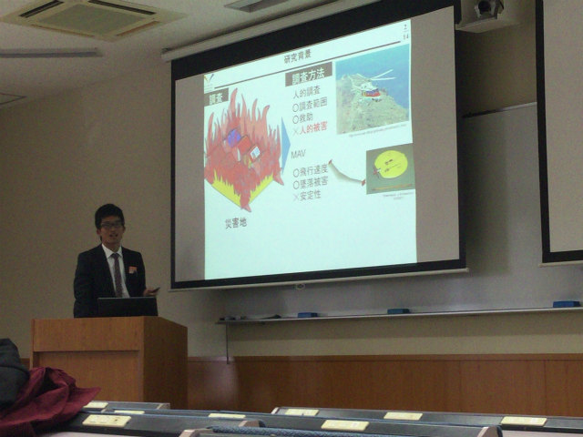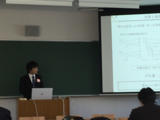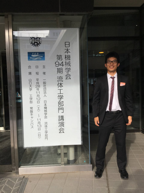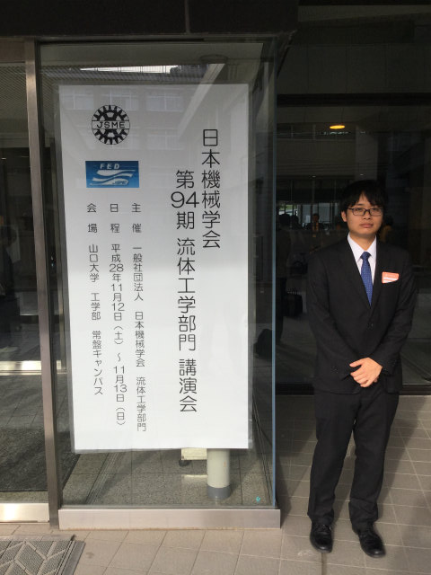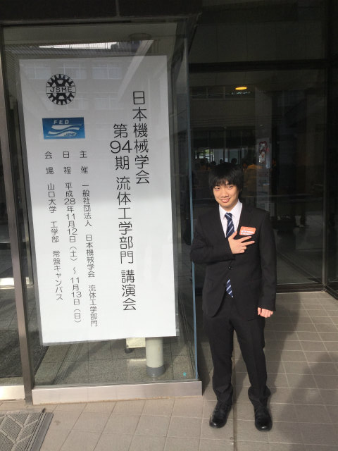 去年に引き続き今年も流体工学部門に参加.流体計測の研究で,M2のY西くんが「低レイノルズ数周期流での NACA0012翼周り剥離流れのPIV解析」,M2のTMくんが「タイヤモデル周りの3次元はく離流れのPIV計測」を発表しました.光の研究で,M1のHくんが「多波長ホログラムを用いたディジタルホログラフィ粒子計測法に関する一考察」を発表しました.村田先生も光の研究で,「ディジタルホログラフィ粒子計測における高解像度数値像再生の性能限界」を発表されました.撮影はY西くんとHくんの発表は村田先生です. |