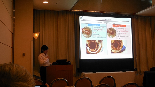 M2のT口さんが,ICSV25において音響計測の研究で「INFLUENCE OF APERTURE RATIO ON AMPLITUDE AND PHASE OF INPUT IMPEDANCE IN A HALF-STOPPED HORN」という題目を発表しました.ホルン奏者でもあるT口さんの演奏法について実験と計算に基づいた発表です.写真はT口さん. |