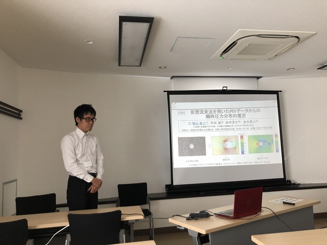 昨年に続いて、日本実験力学会で発表です。 M2のT田さんが流体計測の「周期的に回転する円形容器を用いた流体撹拌手法の性能評価」という題目で、M1のY山さんが流体計測の「仮想流束法を用いた PIV データからの瞬時圧力分布の推定」という題目で研究発表しました。 二人で参加です。写真は主にT田さんの検閲が入っています。 |