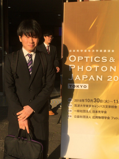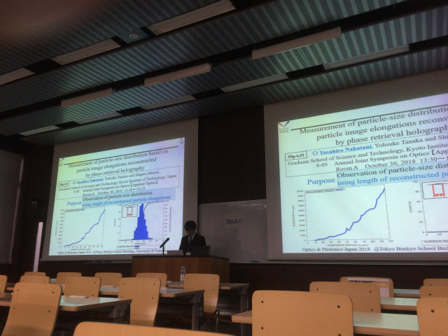OSJ-OSA Joint Symposia on Optics 2018で,M1のN谷くんが光計測の研究で"Measurement of Particle-Size Distribution Based on Particle Image Elongations Reconstructed by Phase Retrieval Holography"の発表をおこないました.初めての英語口頭発表はかなり緊張したようです. |