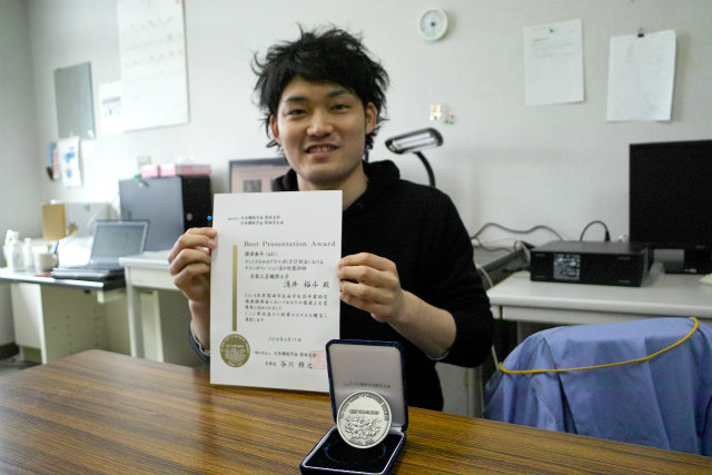 3月に開催された関西学生会 平成25年度学生員卒業研究発表講演会で講演を行ったB4の淺井くんが、BPAを受賞しました。題目は「ディジタルホログラフィ粒子計測法におけるデコンボリューション法の性能評価」で受賞です。当日は懇親会で盛り上がりました。平井くんに引き続き2年連続受賞です。