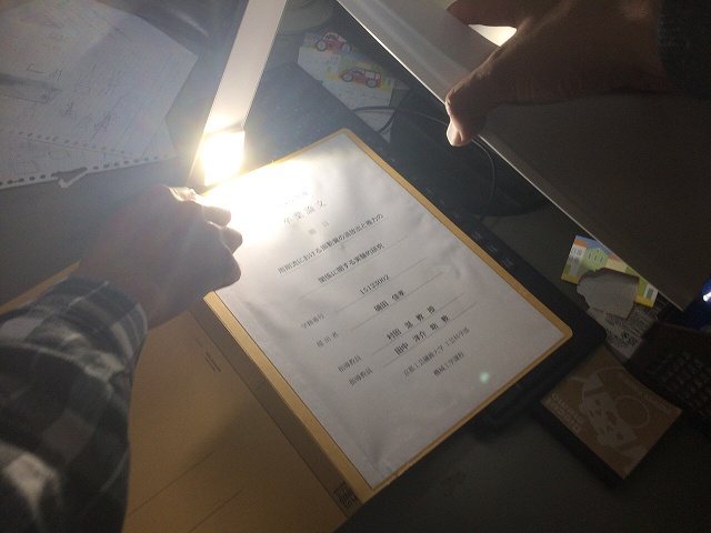 去年と同様に週明け月曜が提出。体裁は大事なので、冊子作成はそれぞれ工夫して作ります。 これといったやり方がないので、毎年提出する人によって違うのが面白いです。今年は外観検査とかで盛り上がりました。あまりに長いのでコメント無しでお楽しみください。
