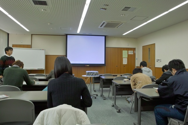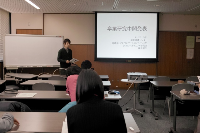 昨年は午後にB4が6人、M1が2人中間発表でしたが、今年は午後にB4が5人、M1が5人中間発表でした。今年は趣向を変えてFの部屋ではなく,連携センターのプレゼンテーションルームで開催です. |