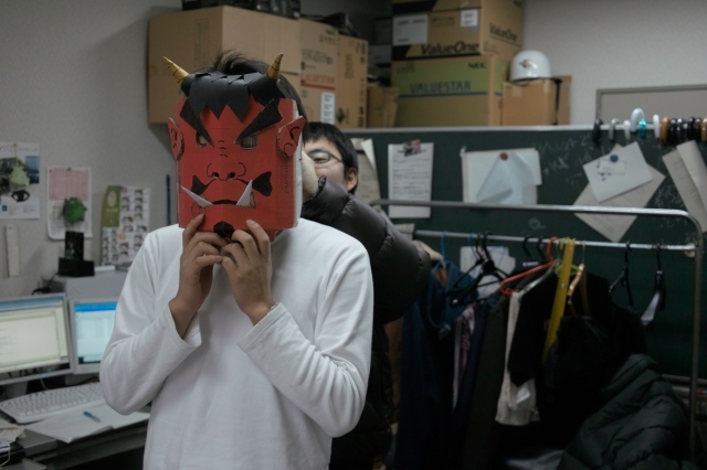 いよいよ豆まきの日が明日に迫ってきました。お面は、エドモンドの空き箱とかの梱包材で出来てます。 目には当然、防豆用にセロハンつきです。1時間程度で完成。フェイスラインの角張りが今後の課題。 |