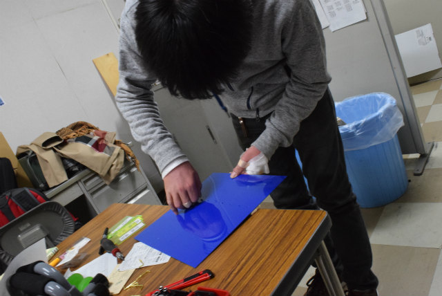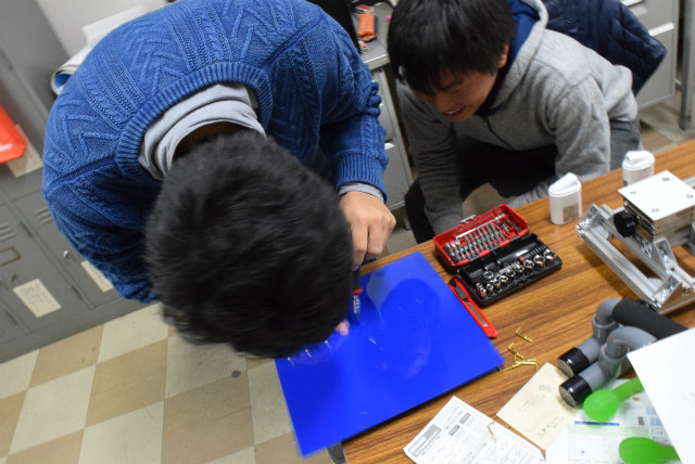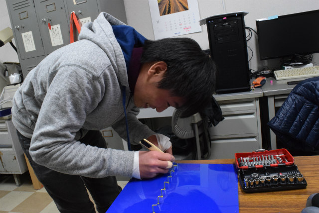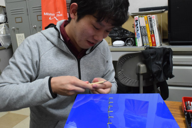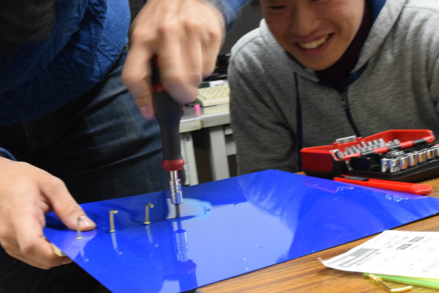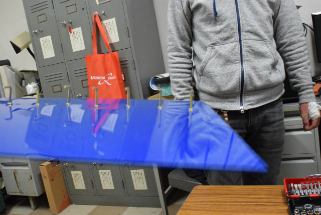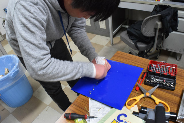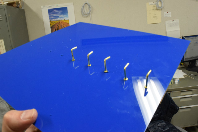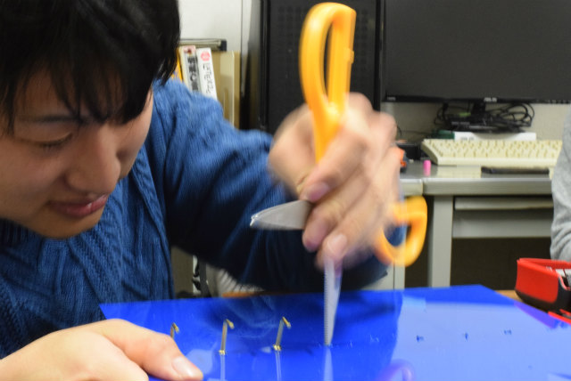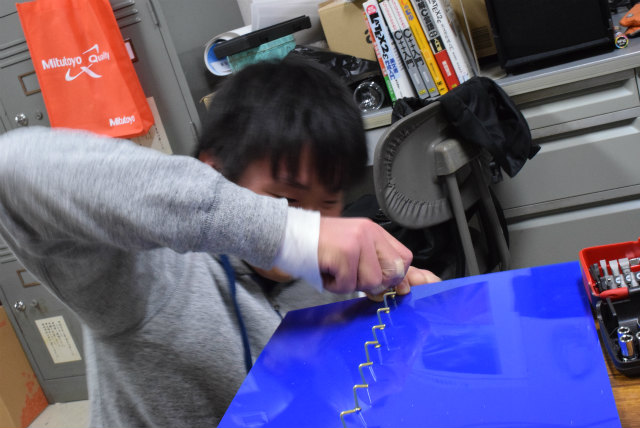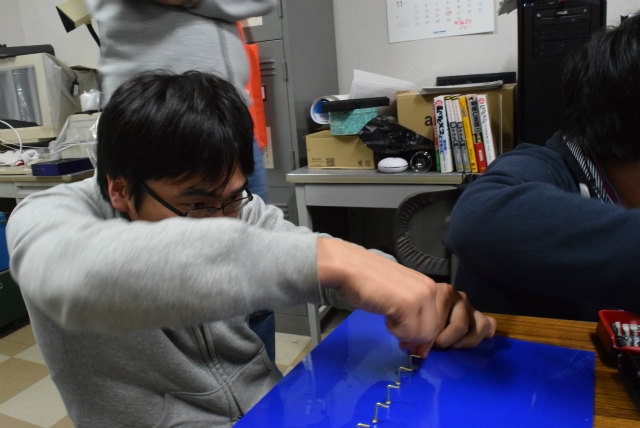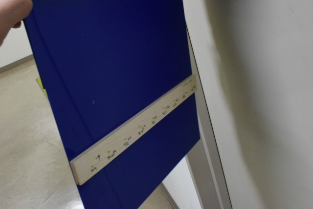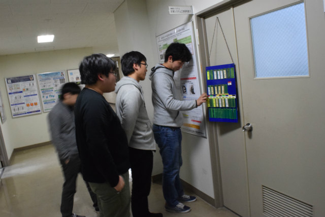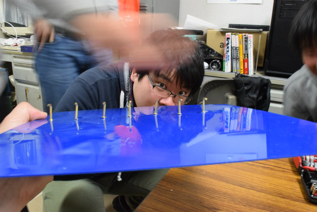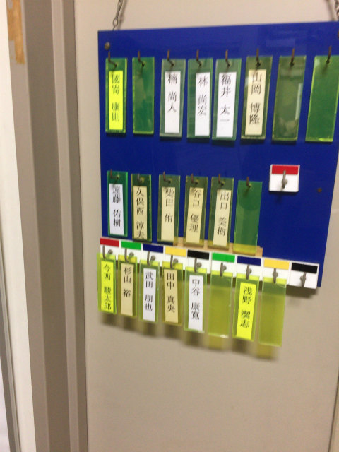 B3配属がそろそろなのですが,名札を下げるスペースが足りません.作り直すことも考えましたが,30年以上前からあるようなので拡張することにします.助教の人のざっとした設計を基にして,色合いが近いアクリル板と真鍮性のフックを宝ヶ池のコーナンで揃えました.折角なので,フックの取付をどれくらい真っ直ぐ打てるかみんなでやってみました. |