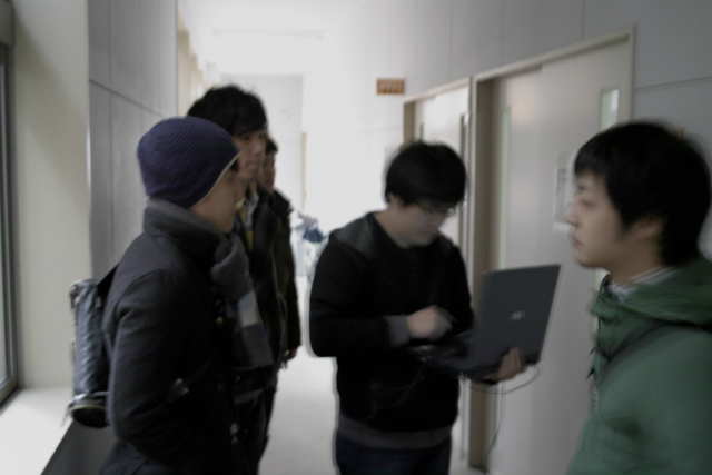 去年は1人で、9時スタートでしかも降雪でしたが、11時スタートでみぞれ程度なので研究室ほぼ全員参加です。なんかムダに疲れるし、いろいろと思っている以上に広範囲にものすごい迷惑なので、セッションの開始前に講演者は会場に着いておいてください。常識的にね。いや、ホントに冗談抜きで真剣にあり得ないから。I上くん2年連続ありがとう!そしてE川くんも。 |