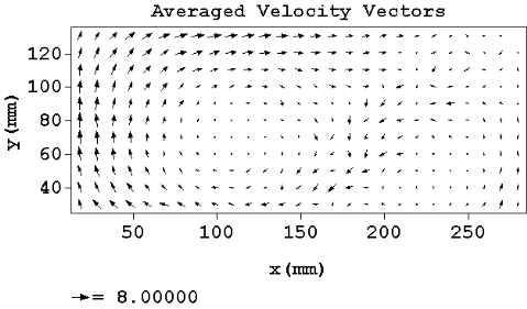 下の速度ベクトル図は上に示した流れ場を画像解析した時間平均結果です。右側壁からの流入部が少し不明瞭ですが、左半分の領域において時計方向に旋回する流れが観測できています。標準的な画像取り込みボードと短時間に2回連続パルス発光できる照明装置があれば、かなり高速の流動現象も捉えることが出来ます。