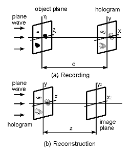 ディジタルホログラフィ(digital holography)は上述の像再生過程を観測したホログラムパターンを用いてコンピュータ内部で処理するものです。