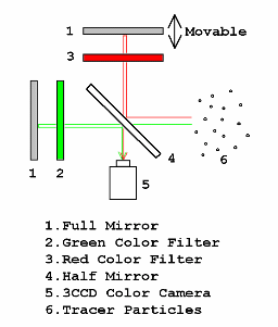 上の全反射鏡(1)を上方に移動させると緑と赤の経路の長さに違いが生じ、画像ぼけ程度の異なる像が観測されます。そして、それら焦点位置の異なる画像を赤画像および緑画像として記録し、それらの2枚の画像間で演算を行って粒子奥行き位置を求めます。