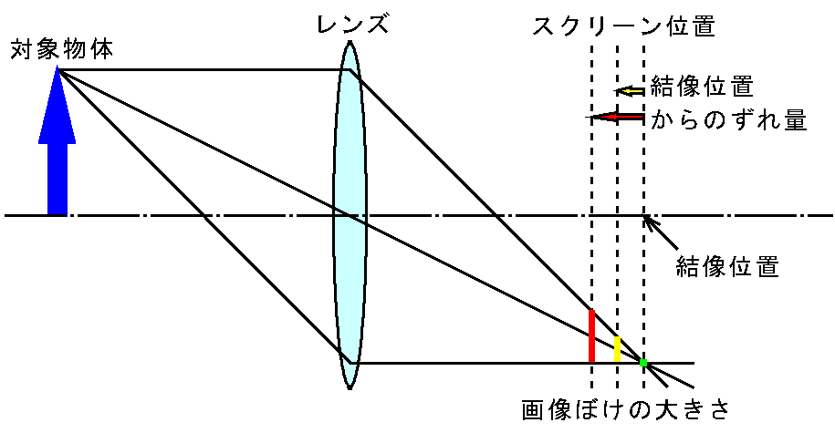 下の図のように、対象物体を凸レンズでスクリーンに結像させる場合を考えると、レンズの結像公式を満足する位置では、対象物体のある1点からでた光はスクリーン上の1点に集まりますが、スクリーン位置がずれるとそのずれ量に相当する大きさの領域に光は広がります。これが画像ぼけとなります。逆にこの画像ぼけの大きさを画像処理で求めると、結像位置からのずれ量を得ることができます。そして、その