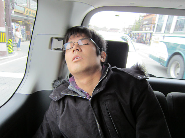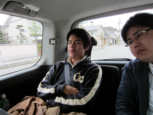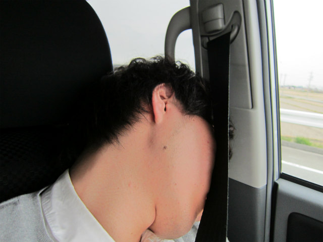 助手席で寝てるし、助手席で! |