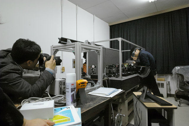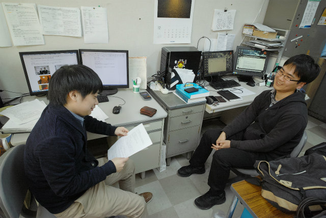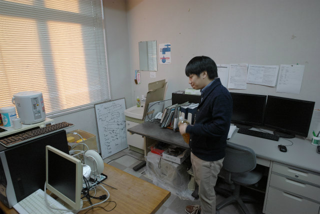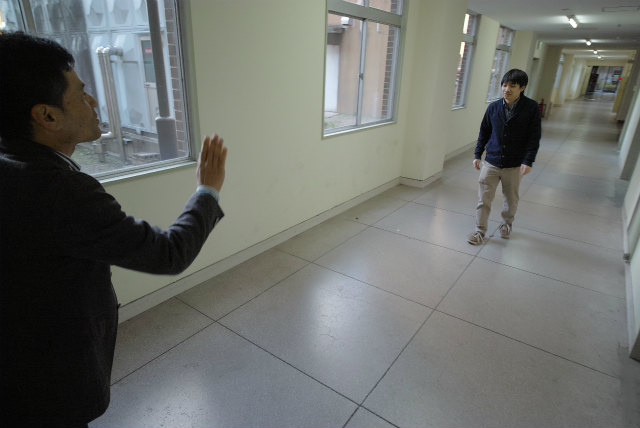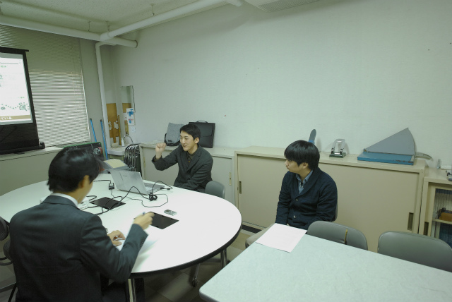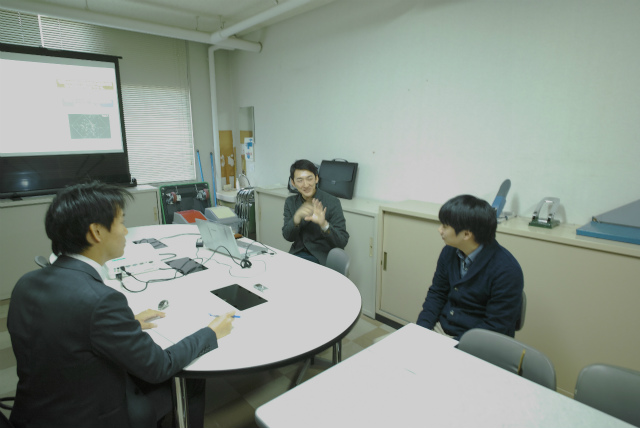 入学案内のパンスレット向けに計測研のインタビューがありました.学生メインのインタビューでM2のHくんが担当です.本学の大事な広報活動.まずは,助教の人がいつも研究室配属時期や学外からの志願者向けにする教育・研究理念をベースに学生の募集についてのプレゼン.あとは実験風景とHくん撮影とHくんのインタビューでした. |