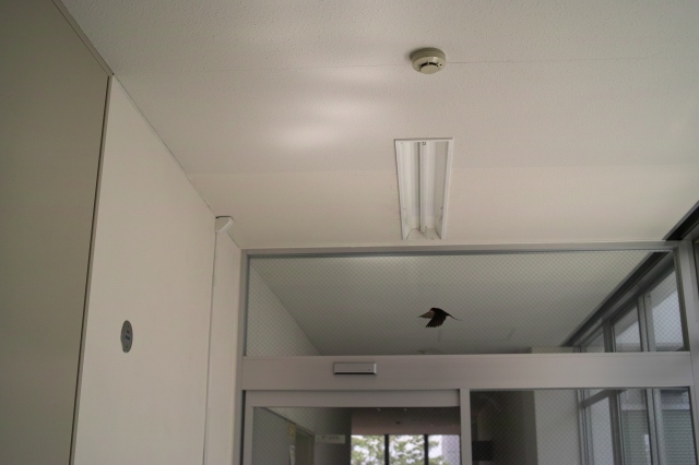 建屋内でツバメが飛んでる |