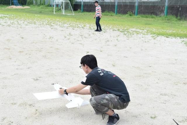 夏期休暇に入り運動部に明け渡すため運動場貸切実験はいったん終了.飛ぶようになって来ましたが,まだ高度をあげられない.上げないと運動器具にぶつかるし,あまり上げてしまうとネットを越えてしまう.まずは低めからですね. |