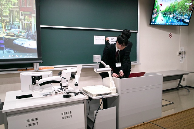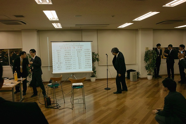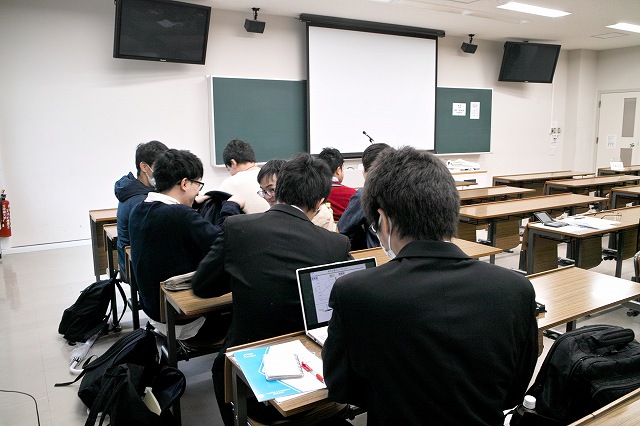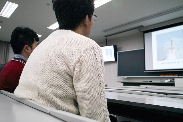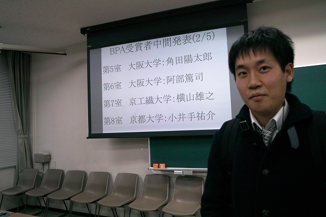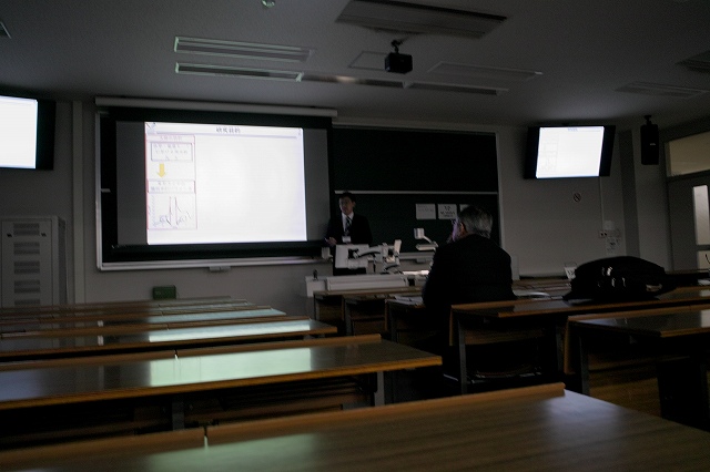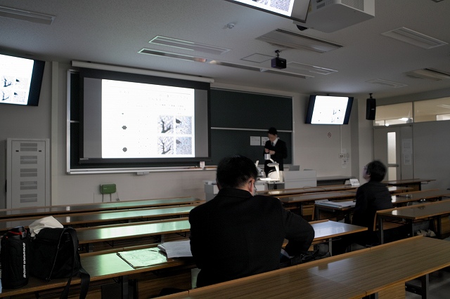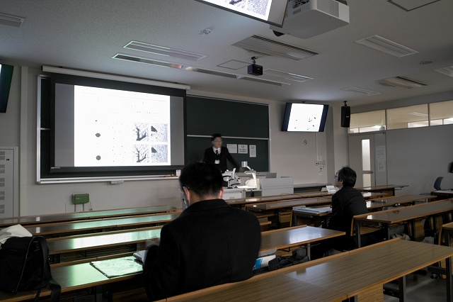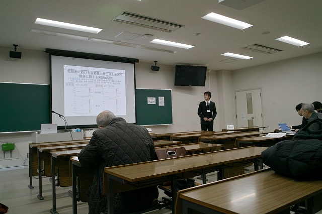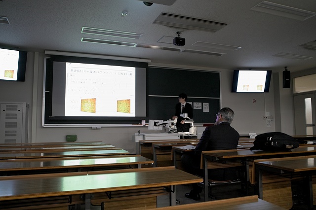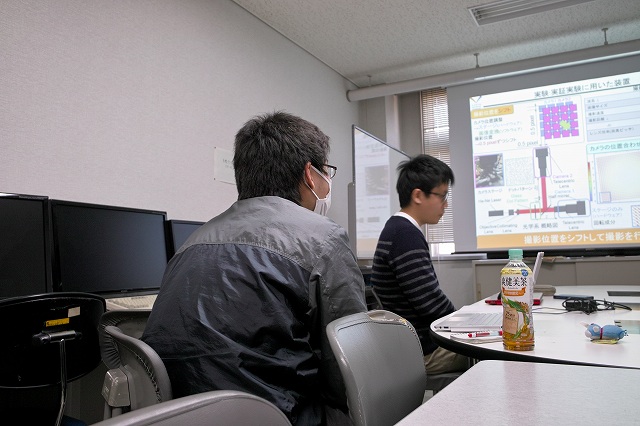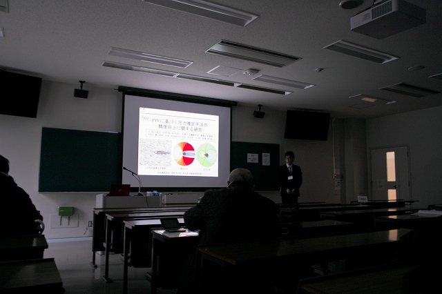 去年は2人でしたが、今年は5人発表です。I田さんが流体計測の研究で「周期流における振動翼の渦放出と推力の関係に関する実験的研究」、 Y山さんが流体計測の研究で「PIV に基づく圧力推定手法の精度向上に関する研究」、M四さんが光計測の研究で「2 台のカメラを用いた位相回復ホログラフィにおける空間解像度の向上」、M山さんが光計測の研究で「多波長位相回復ホログラフィによる粒子計測 」 、S山さんが音響計測の研究で「二段階直管モデルを用いたタイヤ空洞共鳴周波数の推定 」という題目で発表しました。来年の下見にB3も参加しました。発表練習の時にも鋭い質問で大いに貢献しました。 |