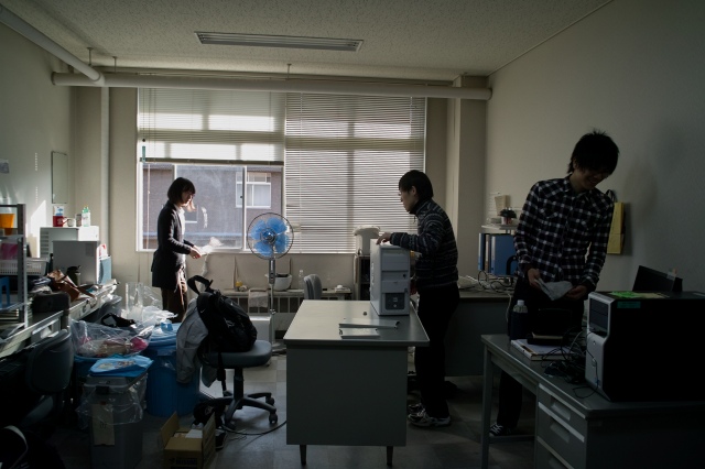 K岡さんに机をどけなくても掃除できると弁明中のふたり |