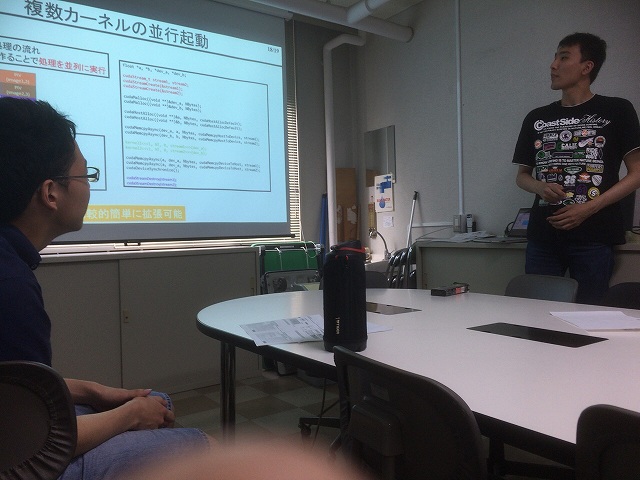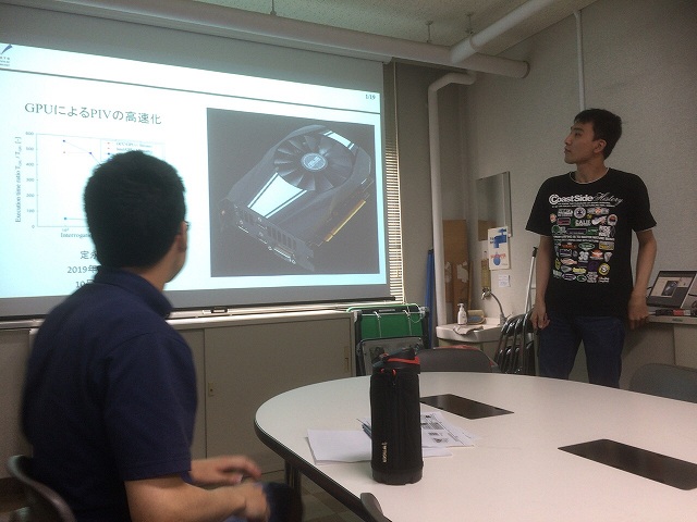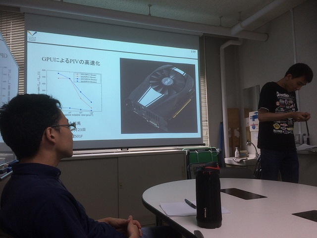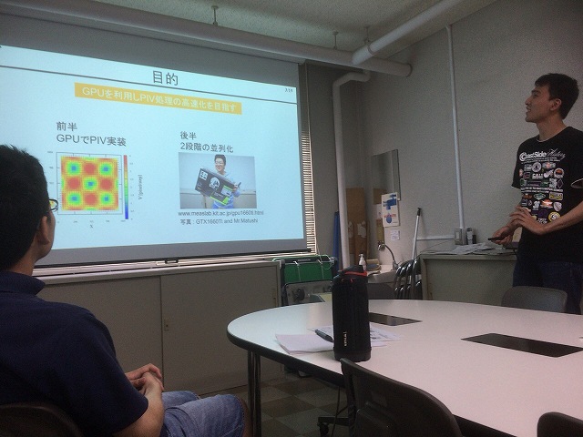 前回はホログラフィでした.その後,M2のN谷さん,B4のM村さん,助教の人が実装して100倍速くなり,もはやGPU前提で研究が進んでいます. 今回はB4のS永さんが講師でPIVについてレクチャーしてくれました.条件によっては500倍とのことで,PIVユーザーの人たちは歓喜です.実装時に嵌まったポイントの解説があり,貴重な内容でした. |