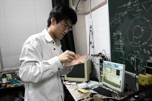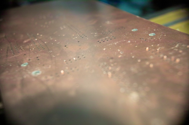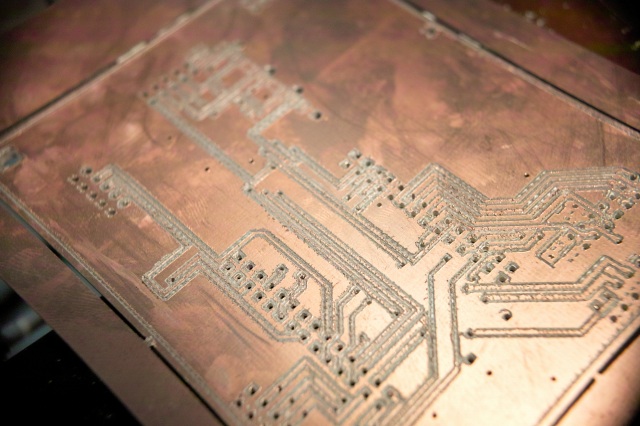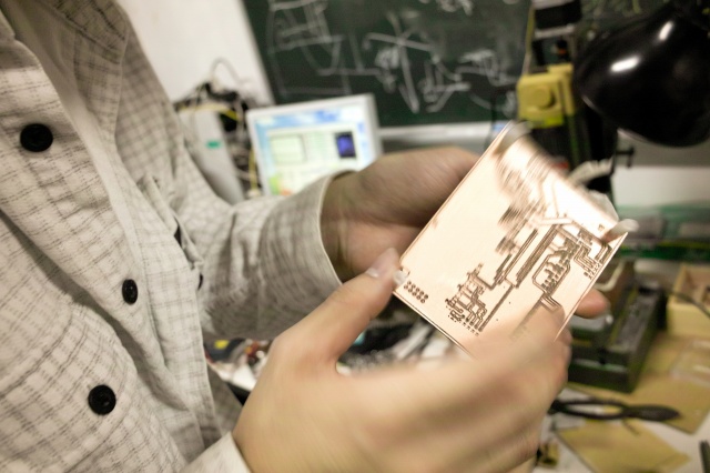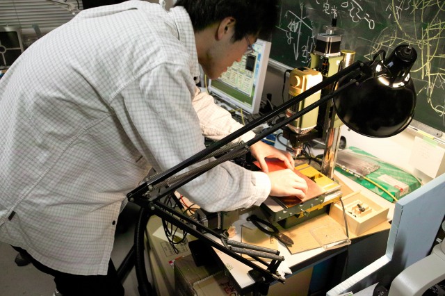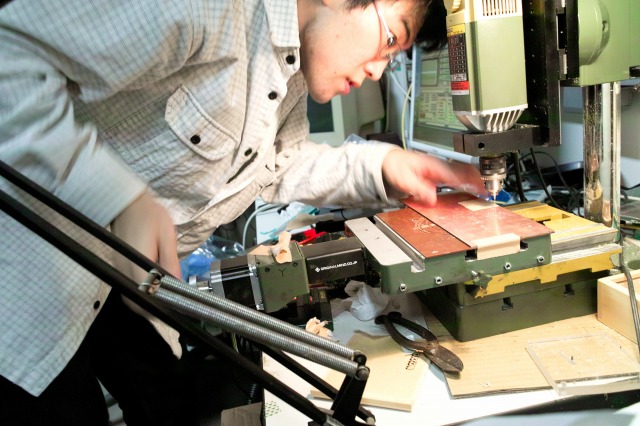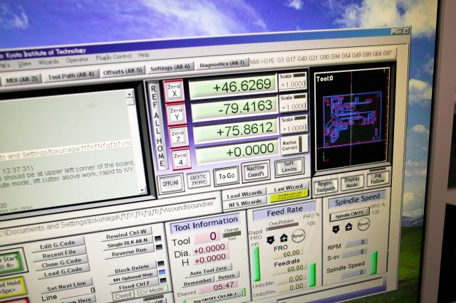 バックラッシュ防止などで立上げ中だったNCが、T永くんの最終調整で運用に入りました。最後は、テーブルの慣性、モーター待機電力まで考慮すると、カタログ値(それ以上かも)で動作するまでに。これはボールネジの脱調とかトラブルで大変になるほど、妙にうれしそうなT永くんだからこそ可能な最終調整です。もうこれでご飯食べていけるよ(ホントに食べていくのですが)!それでは、T永くんの両面切削基板製作の様子を見てみましょう。 |
