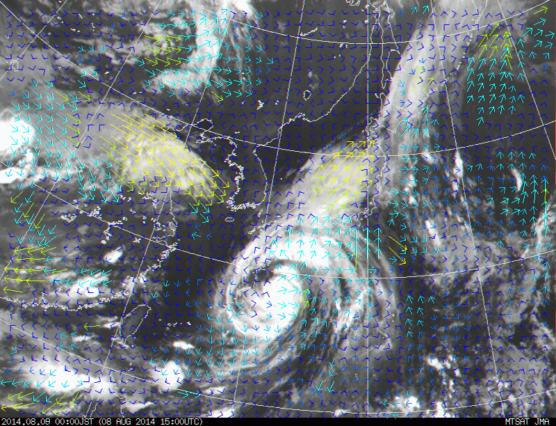 台風の接近を気象衛星の画像(20140809-0000-0830)でPIV解析 | ||