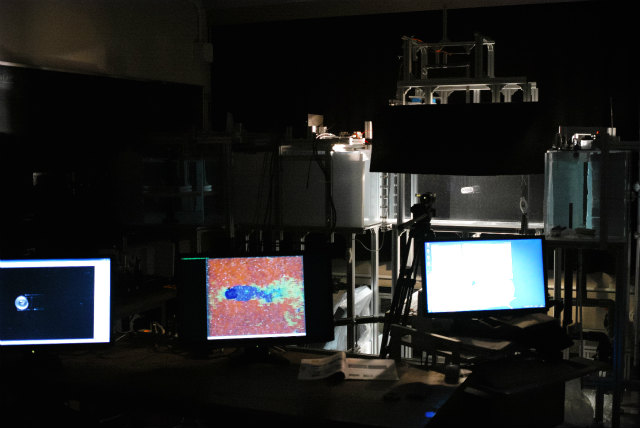 奥の水槽に測定対象の円柱、左から撮影画像、PIV結果、カメラとプログラム操作の液晶画面。 |