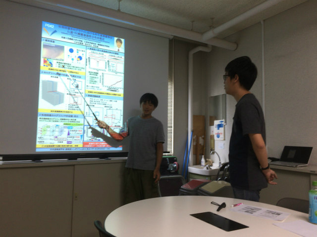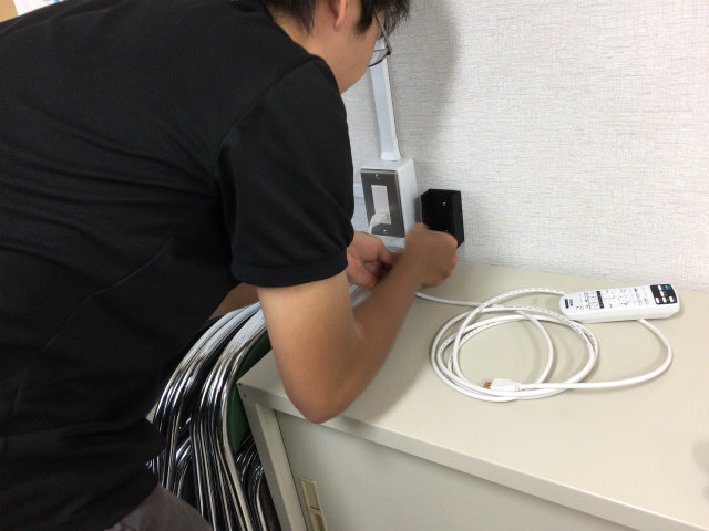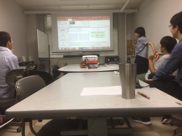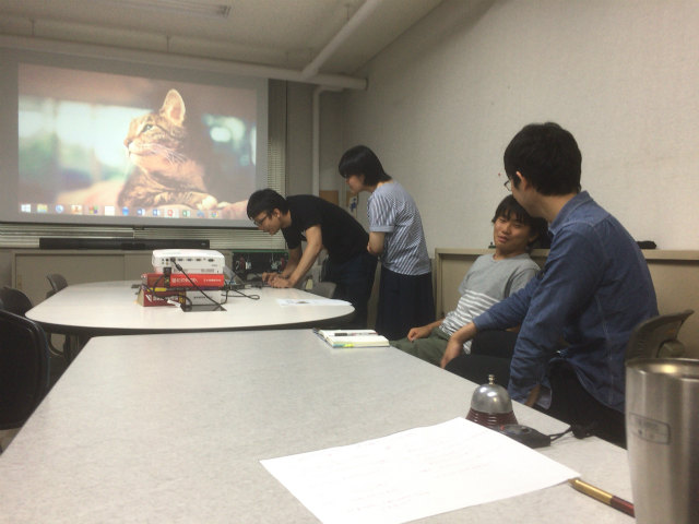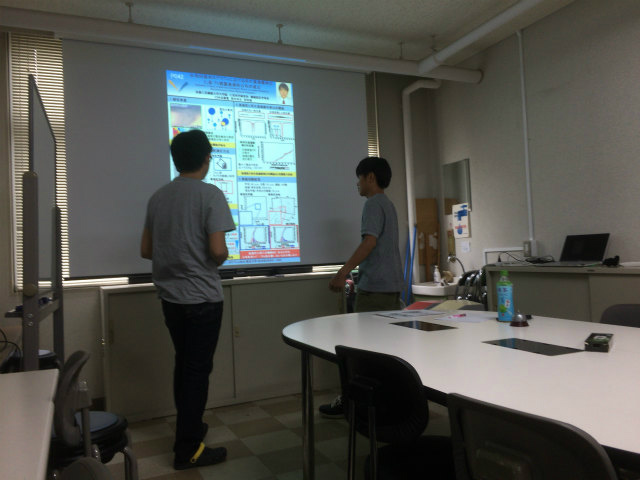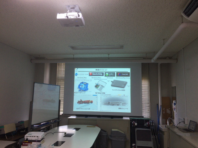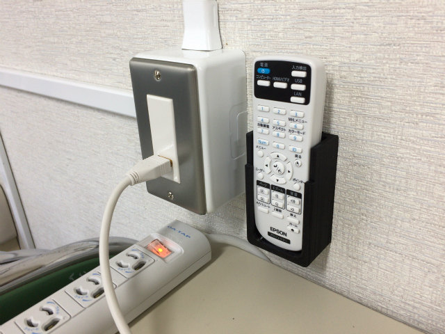 計測研が進めていたプレゼン環境整備が完了しました.昨年はスクリーンを60インチから天吊りの100インチに拡大して,今年はプロジェクタの天吊り工事をおこないました.Fの部屋は週末報告会,月末報告会,研究打合せ,工学実験,共同研究打合せ,発表練習,ケーキ食べたり,タコ焼きしたり,大学院模試したり,電源交換したり,などなど多目的に使います.その度にプロジェクタの設置準備と片付けの前後時間が無駄でした.今回の工事ですぐにプレゼン可能です.これで隙間時間にも個人練習が出来るようになって教育効果がバッチリ.後日(8/21)カメラ用治具作成のついでに,I田くんがD-lab デザインファクトリーの3Dプリンターでリモコン入れを作ってくれました. |