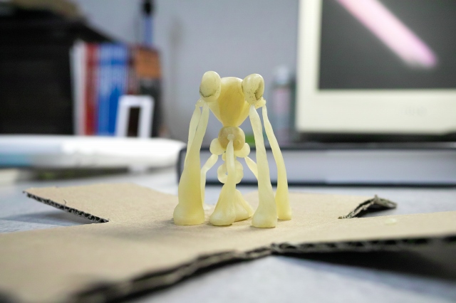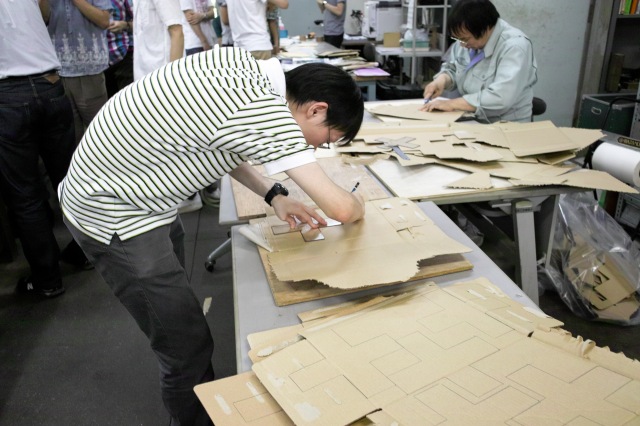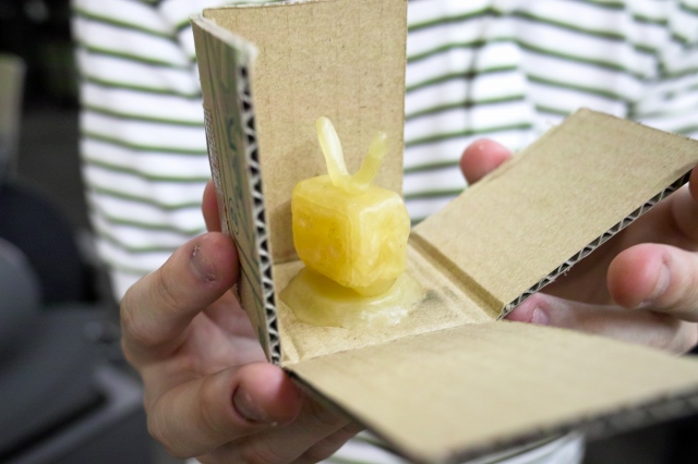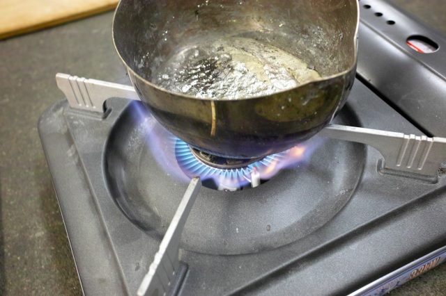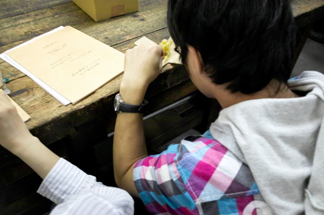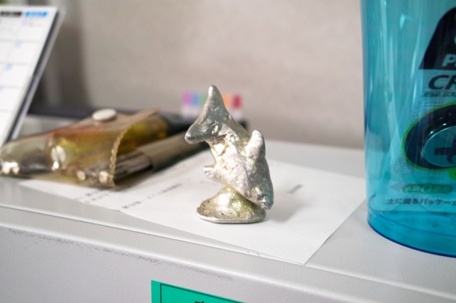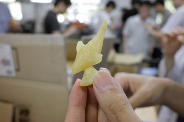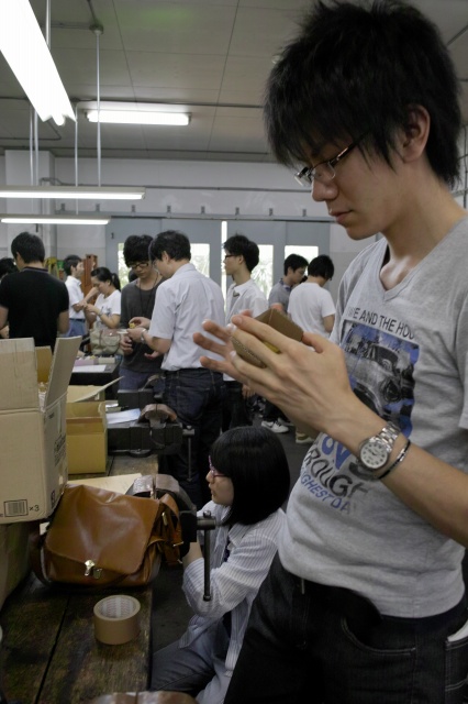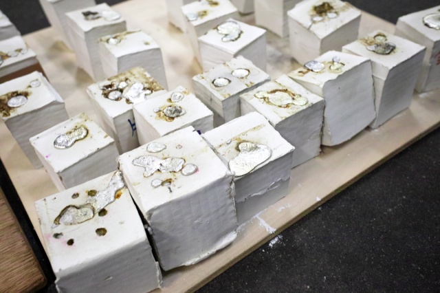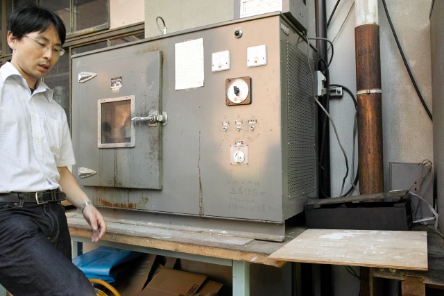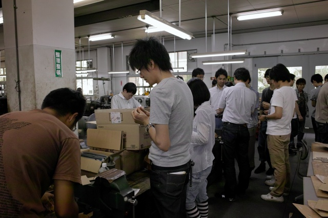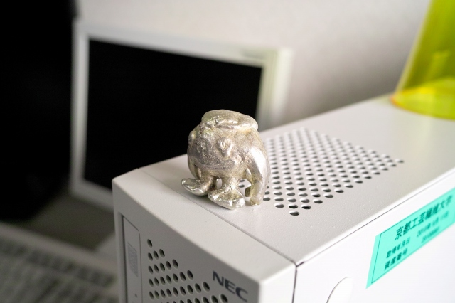 例年、機械システム工学部門はものづくり体験学習という一般向けの講座を開いています。今回はそのリハーサル。参加者が行う鋳造を説明員役のM1が練習します。鋳造は精密部品の作成にも使われるロストワックス法です。 |