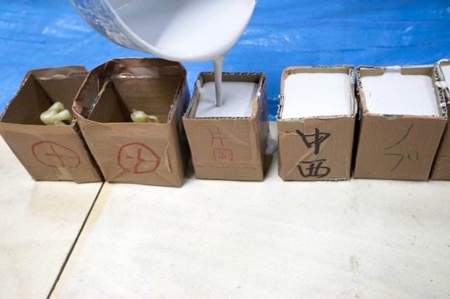 石膏が乾いたらワックスを一晩加熱して抜きます | ||