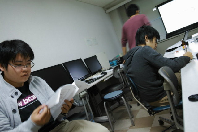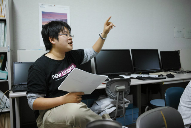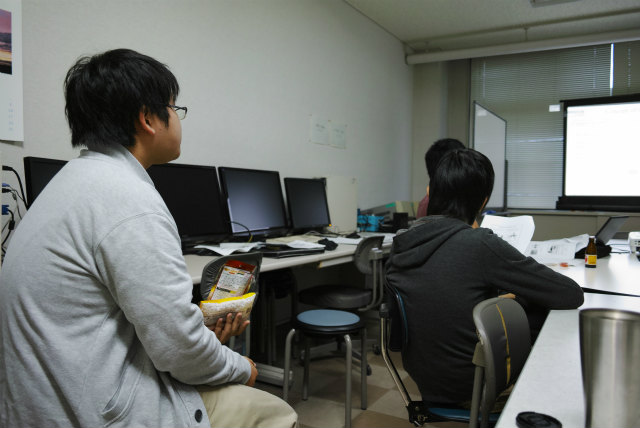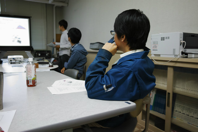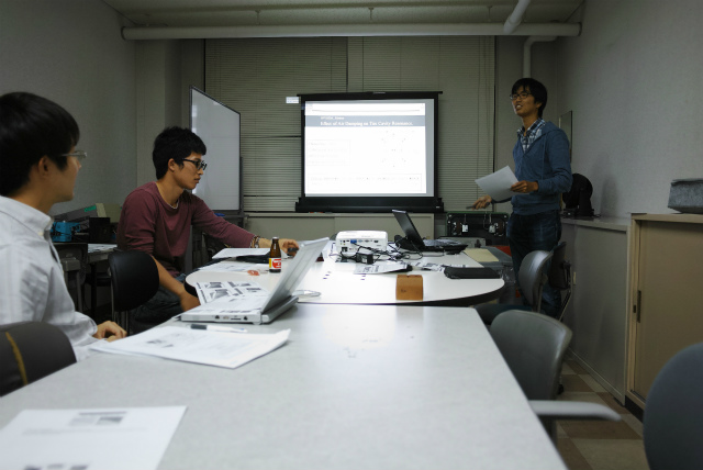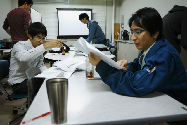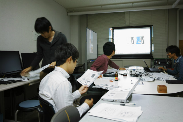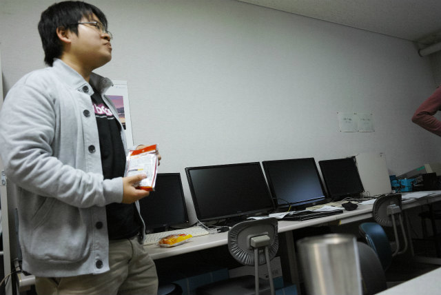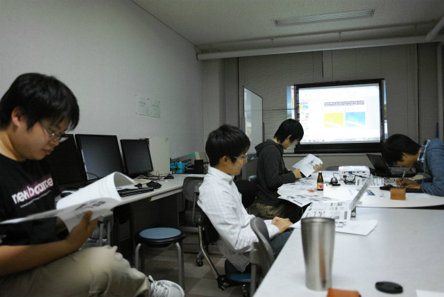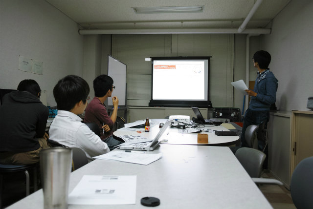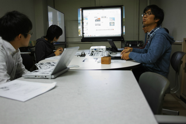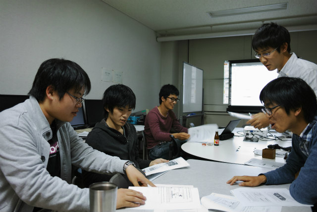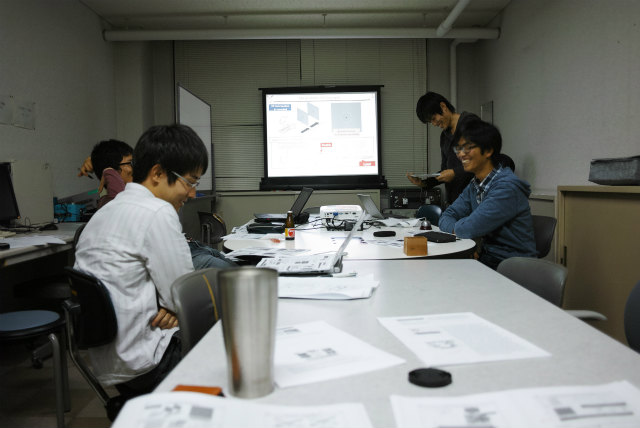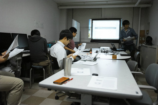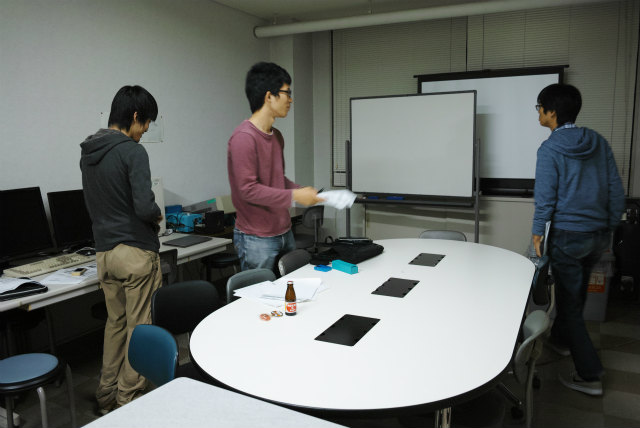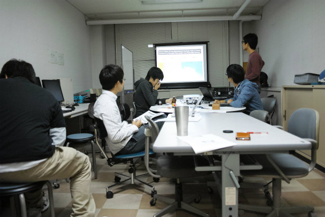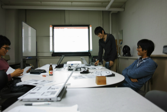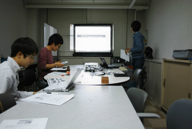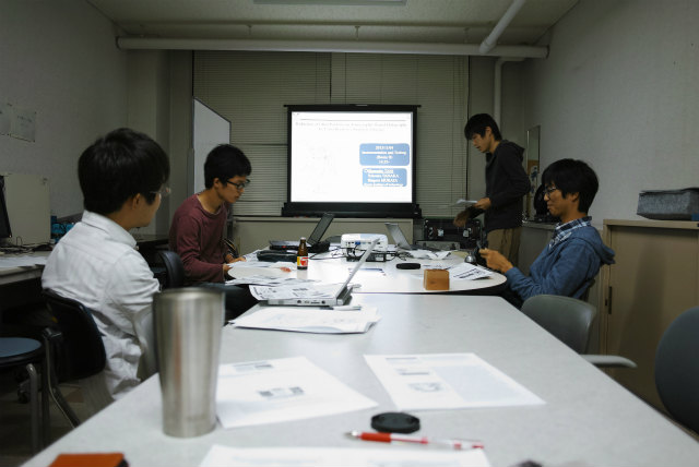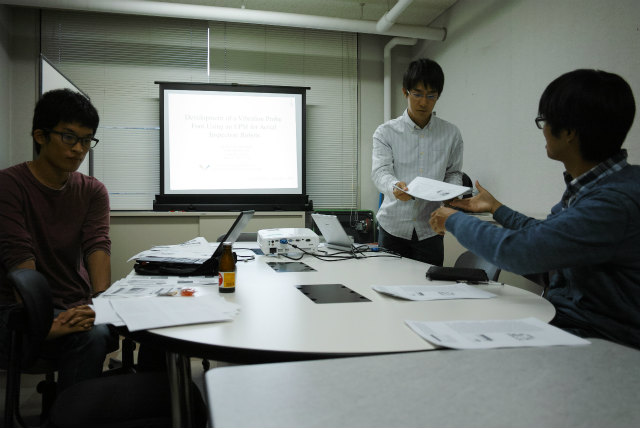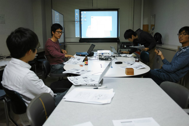 来月1日から4日開催の10th ISEM '15-Matsueで発表するロボ研B4のA堀くんと計測研のM2のShogo,M1のTNくん,Y西くんの練習を合同で行いました.ぼちぼち台詞原稿と質疑応答スライドも仕上がっている状態です.ロボ研の東先生と助教の人(余白撲滅委員会の委員長,デザイン統一会派の代表)立ち会いです. |