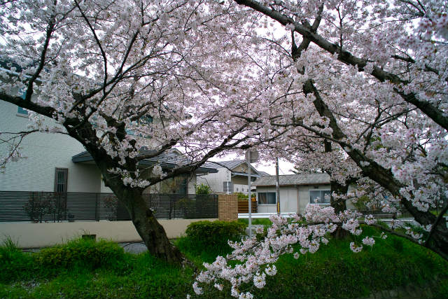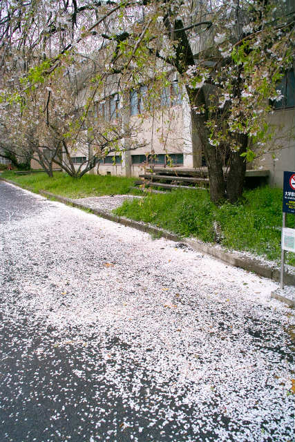 去年より一週間くらい早いです。ここ4年では一番早い時期に満開ですね。あいにくの天気ですが、「花に嵐のたとえもあるぞ」ということで、お昼休みに散策してきました。 |