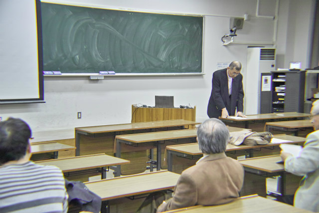 去年は5月開催でしたが、今年は4月になりました。会場は1号館1101号室です。村田先生は会計を担当しています。助教の人は監査です。総会の後は講演会と懇親会です。講演会は2題目。 |