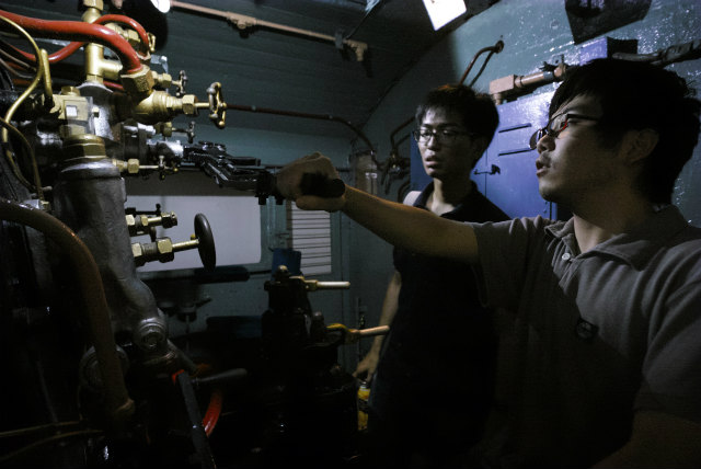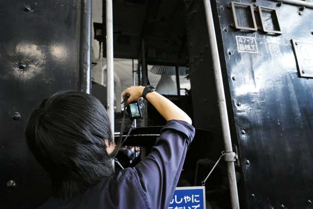 加減弁ハンドルを握る機関士(H谷川くん)と機関助士(Shogo) | ||