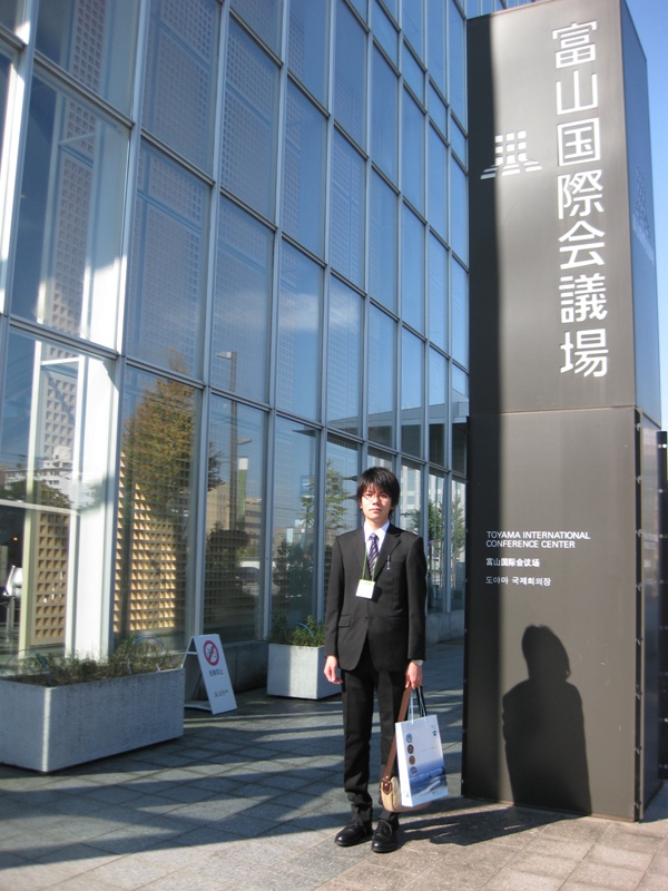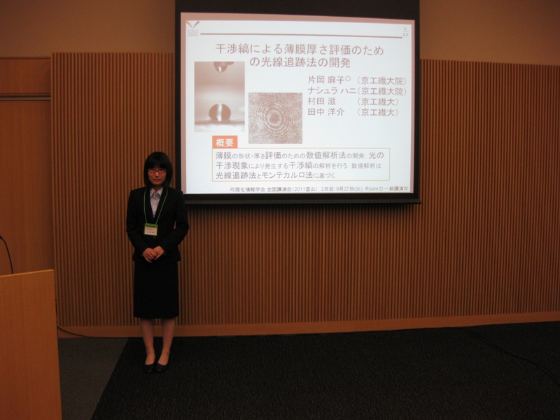去年は助教の人の発表でしたが、今年はK岡さんが、可視化情報学会全国講演会(2011富山)で“干渉縞による薄膜厚さ評価のための光線追跡法の開発”を発表しました。いつもはコンチェルトですが、今回はソロです。 |