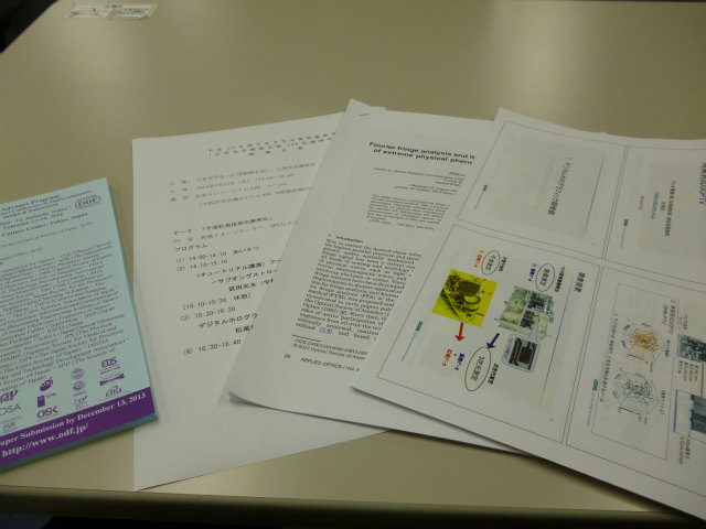 12月に引き続いて今回は平成25年度日本光学会関西講演会(応用光学懇談会第146回講演会)にホログラフィの研究をしているB4A井くんが受講しました。E田くんはどうしても受講した講義があったそうです。単位が足りないとかではなくて。とにかく、A井くんはホログラフィの理解がさらに深まったとのことです。撮影はA井くん。 |